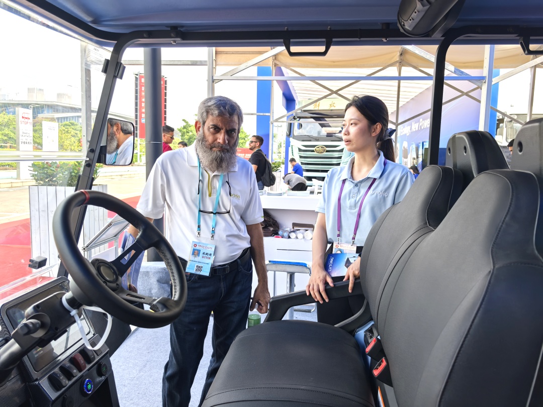 本次广交会,2138CC太阳集团科技还带来了换新升级的C727系列创新款高尔夫球车,多媒体系统配置更高,含RKE、PKE感应遥控钥匙,可一键启动,外观可根据应用环境与客户需求选配沙滩轮胎,独特的外观和升级的配置吸引了多国客商驻足关注。